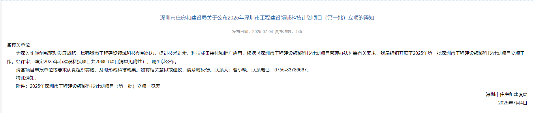 ?由公司牽頭申報的科技項目《面向智能建造的高層建筑全生命周期數(shù)字智能健康監(jiān)測技術(shù)研究與應(yīng)用》,成功通過2025年深圳市工程建設(shè)領(lǐng)域科技計劃項目(第一批)評審并獲批立項。